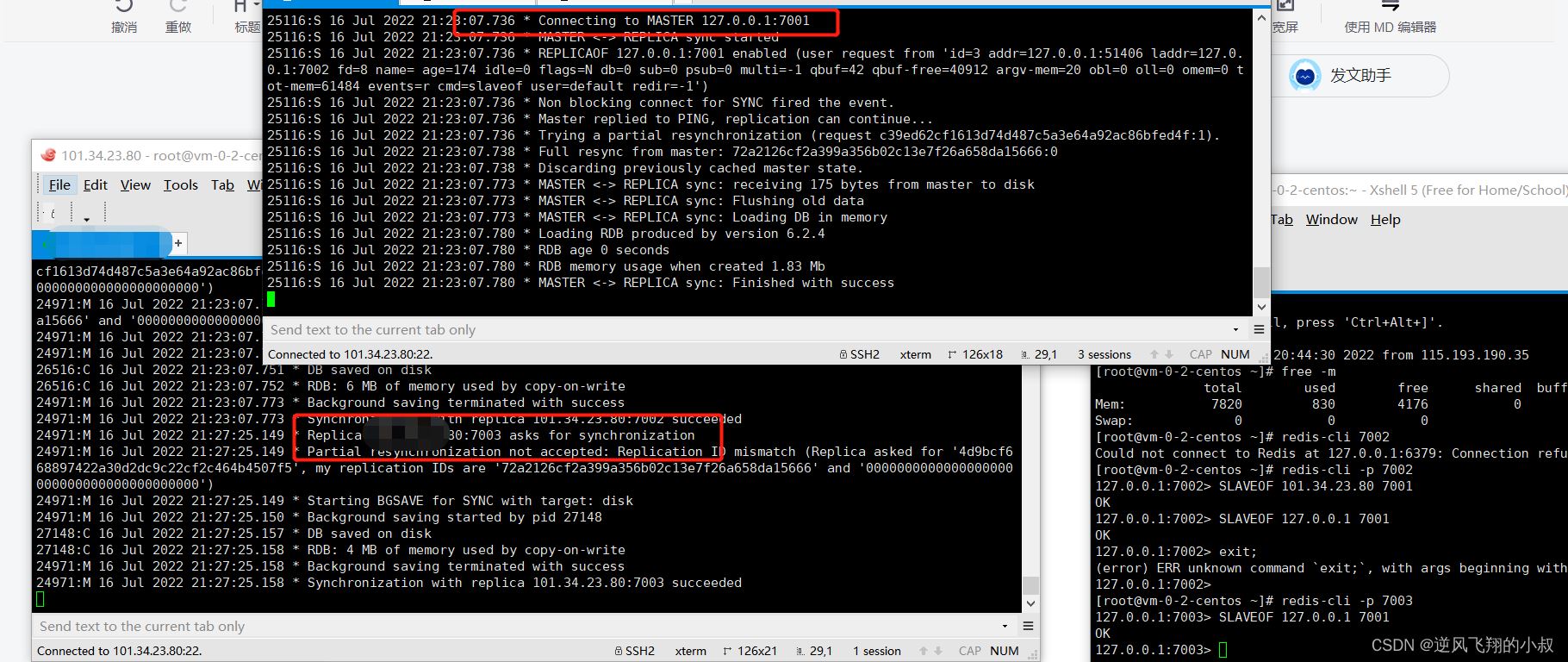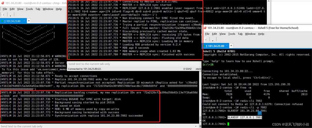 执行完成上面命令的瞬间可以看到7001和7002两个实例控制台的输出信息,看得出7002完成了对7001的连接以及数据同步
