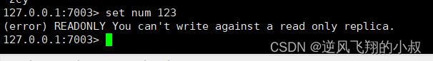 但是如果在7002或7003上面set一个key的时候就会报错,即从节点没有写权限;