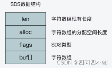 SDS的数据结构里包含:字符串实际长度,字符串分配空间长度,SDS类型,字符数组,其中字符数组buf[]用来保存实际数据,如下图,
