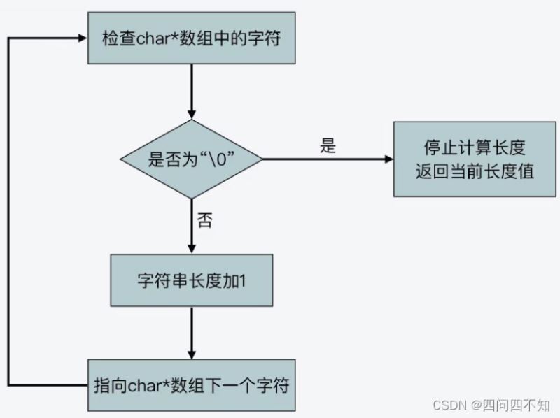 连续的内存空间的所有字符串没有分隔符计算机就没办法区分字符串与字符串之间的位置。在C语言标准库中字符串的操作函数就会通过检查字符串数组中是否有“\0”来判断字符串是否结束。例如字符串操作函数strlen函数,它就是在遍历字符串数组中的每一个字符,并进行计数,直到检查到“\0”,它的时间复杂度是O(n)。流程如下,