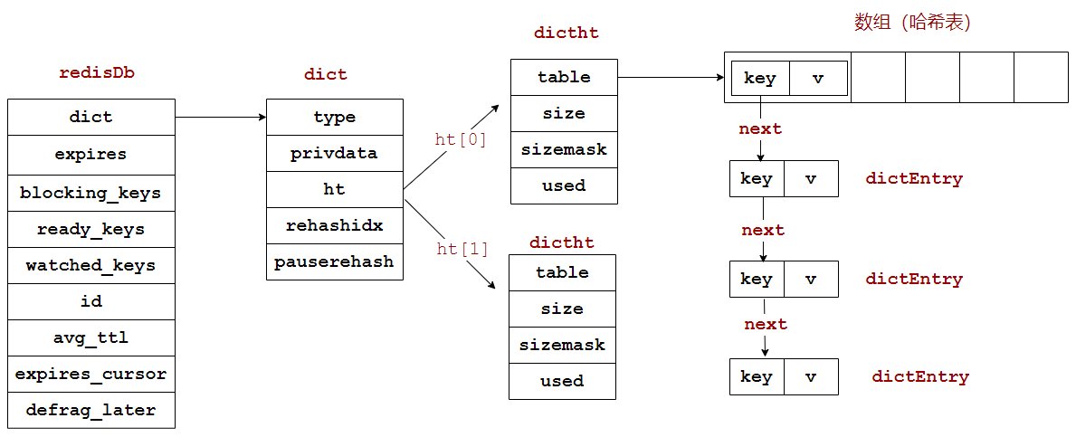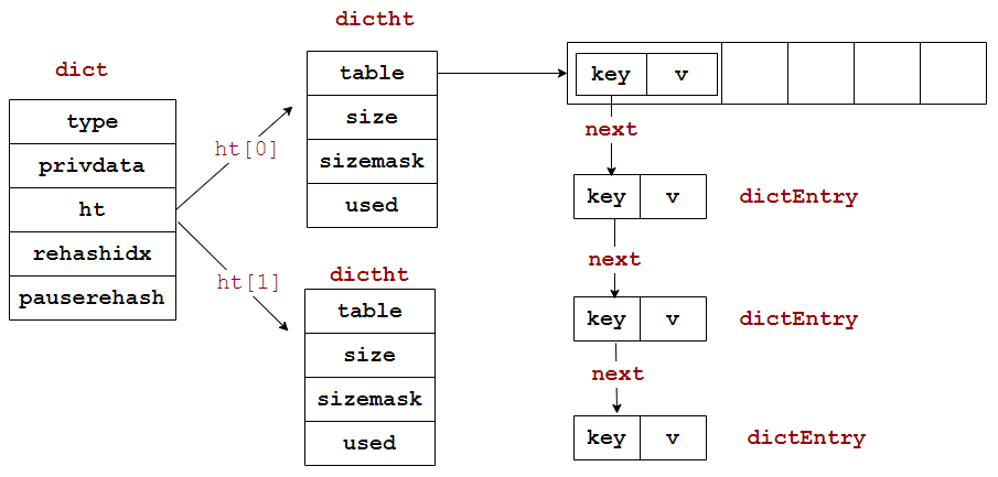 字典dict的结构前面已经看过了,于是整个数据库的结构大概就是下面这个样子: