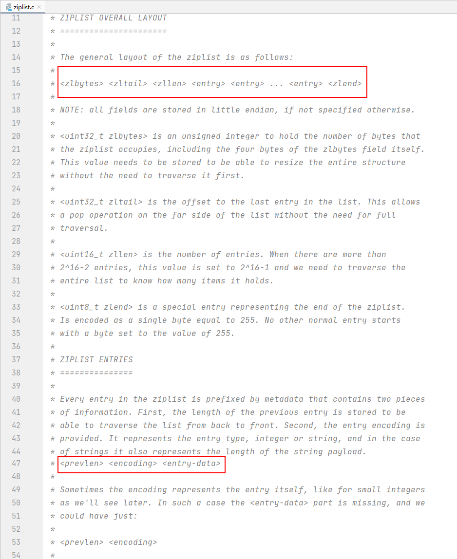 <uint8_t zlend> : 一个特殊的条目,表示 ziplist 的结尾