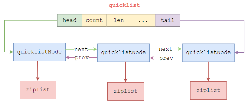 quicklist = linkedlist + ziplist