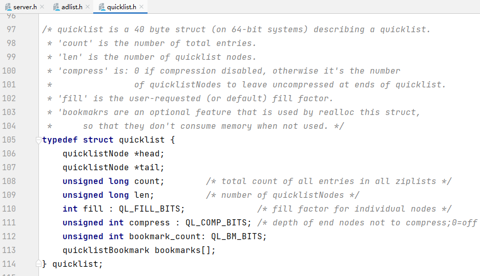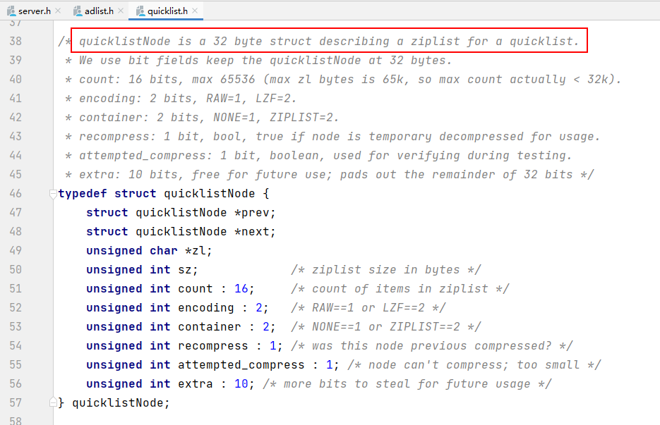 quicklistNode是一个32字节的结构体,描述快表的ziplist。