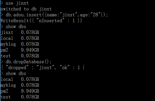 db.adou.insert({name:”jinxt”,age:”28″}); //刚创建的数据库 jinxt并不在数据库的列表中, 要显示它,我们需要向 jinxt数据库插入一些数据