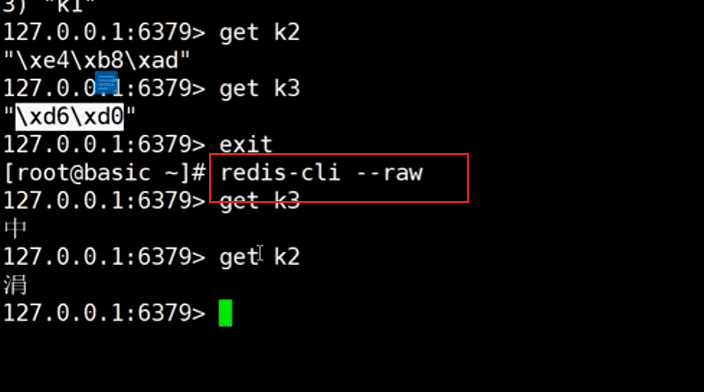 然后退出用redis-cli –raw来登录,会触发一个格式化(如果不带上–raw是只会识别ascii码的,超出部分则按照16进制来展示的,如果加上raw则会触发编码集的格式化)