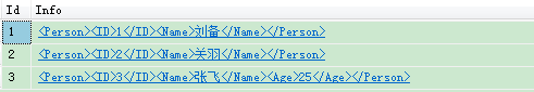 INSERT Person VALUES(3,'<Person><ID>3</ID><Name>张飞</Name></Person>’)