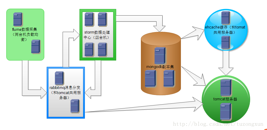 这个系统涉及到flume数据采集,storm数据分析,rabbitmq消息分发,ehcache缓存提升系统性能,MongoDB副本集存储数据,tomcat管理系统应用等,架构基本如下: