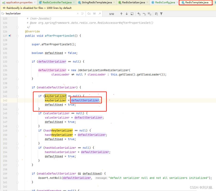 可以发现stringRedisTemplate存入的还是字符串样式,能直接看出属性值为def,然而RedisTemplate存入的key值前面居然多加了一串16进制的字符串值,同时存入redis的结果也是转换为字节数组bytes之后的看不懂的值。