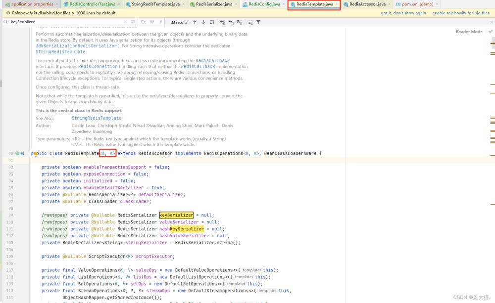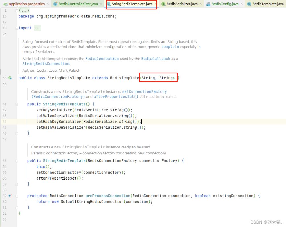 StringRedisTemplate 是继承 RedisTemplate的,一般来说子类继承父类,应该能实现更多的功能,但是此处我们发现 StringRedisTemplate 继承的是 RedisTemplate的泛型类,指定了String-String的泛型!故功能只专注于String类型!