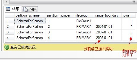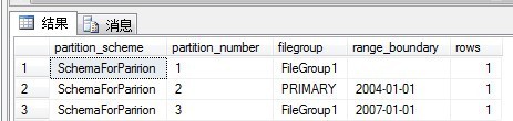 TO(FileGroup1,[primary],FileGroup1) –FileGroup1是自己添加的文件组,因为有两个分界值,3个分区,所以要指定3个文件组,也可以使用ALL所谓的分区指向一个文件组