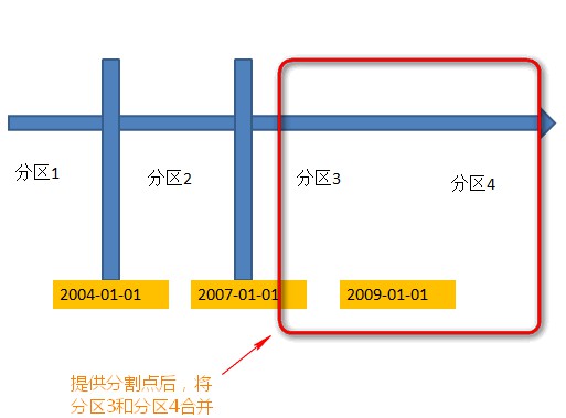 分区的合并可以旱作是分区分割的逆操作。分区的合并需要提供分割点,并且这个分割点必须在现有的分割表中已经存在,否则进行合并时就会报错。