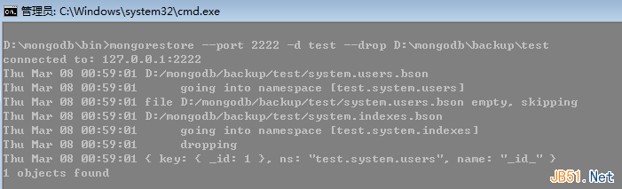提一点的就是 drop选项,这里是说我将test数据恢复之前先删除原有数据库里面的数据,同样大家可以通过help查看。