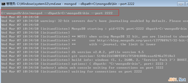先前也说了,mongos要把mongod之间的配置放到config服务器里面,理所当然首先开启它,我这里就建立2222端口。