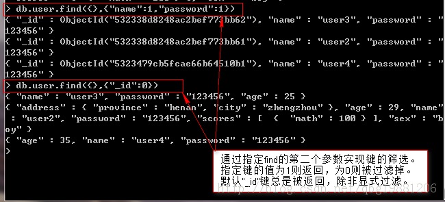 键的筛选是查询时只返回自己感兴趣的键值,通过指定find的第二个参数来实现。这样可以节省传输的数据量,又能节省客户端解码文档的时间和内存消耗。
