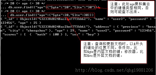 $lt,$lte,$gt,$gte,$ne和<,<=,>,>=,!=是一一对应的,它们可以组合起来以查找一个范围内的值。