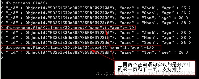 sort:按照指定的键对文档进行排序,1为升序,-1为降序。