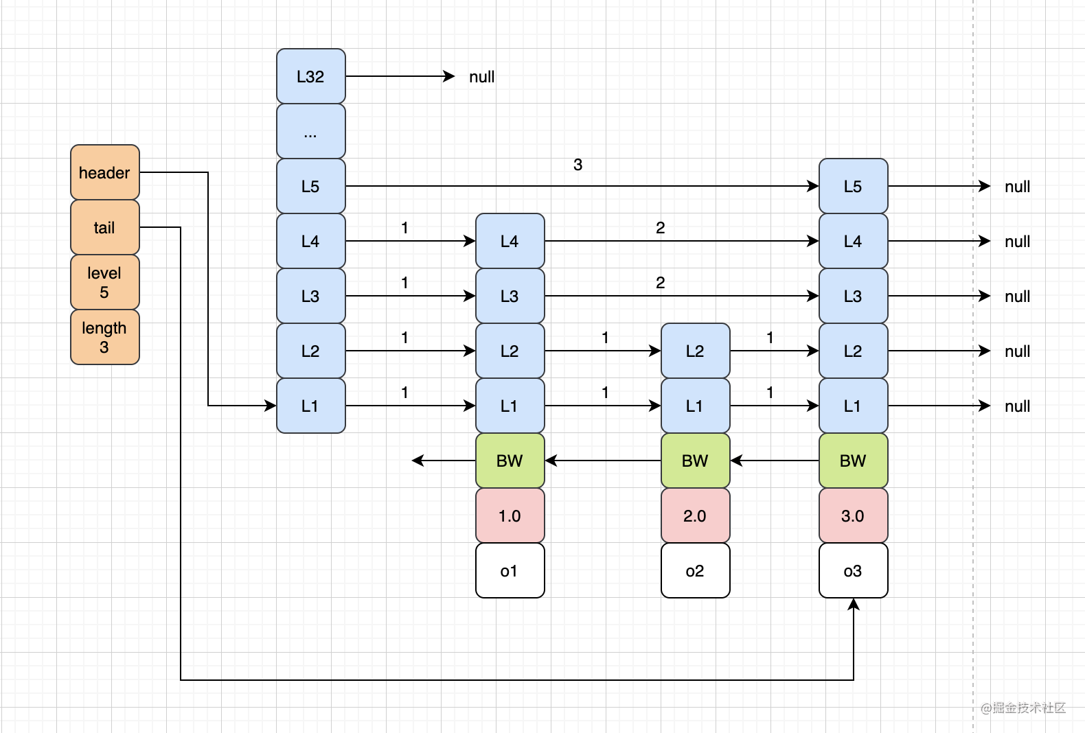 每个节点会随机一个层高,比如o1节点可以通过L4层直接跳到o3,跨度是2,redis的有序集合就是通过这种方式来加快节点之间的访问的。