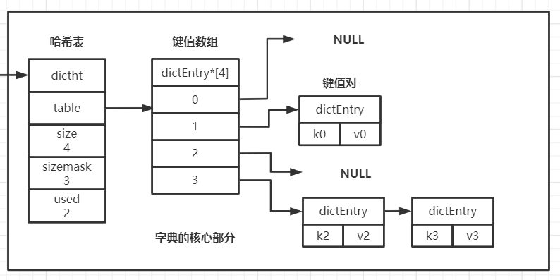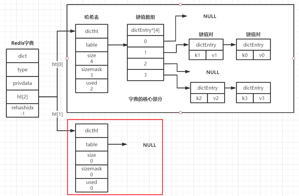 现在你只需要关注其中的哈希表数组ht[2],它的数据类型为dictht,因此也是一种复合的数据结构,如下: