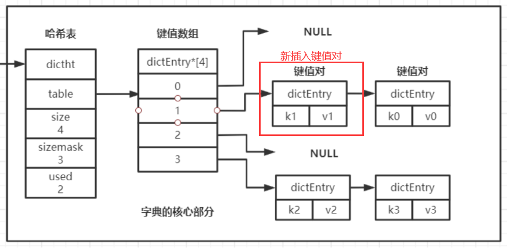 就像上面我要插入一个k1 :v1的键值对,并计算得到插入位置的索引为1(但是distEntry数组中索引为1的位置已经有k0 :v0键值对存放了),因此程序会在哈希表ht[0]的dictEntry数组的索引为1的位置上插入一个dictEntry节点,放在原本链表首部的前一位置(抢占首位),其中存放着k1 : v1键值对,插入后的图如下: