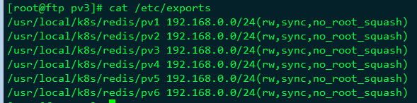 [root@ftp pv3]# cat /etc/exports /usr/local/k8s/redis/pv1 192.168.0.0/24(rw,sync,no_root_squash) /usr/local/k8s/redis/pv2 192.168.0.0/24(rw,sync,no_root_squash) /usr/local/k8s/redis/pv3 192.168.0.0/24(rw,sync,no_root_squash) /usr/local/k8s/redis/pv4 192.168.0.0/24(rw,sync,no_root_squash) /usr/local/k8s/redis/pv5 192.168.0.0/24(rw,sync,no_root_squash) /usr/local/k8s/redis/pv6 192.168.0.0/24(rw,sync,no_root_squash)
