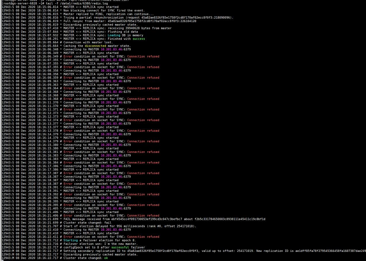 可以看到六个节点都是可用状态,其中83.46的6379是81.64上的6380的从节点,计划Kill掉81.64上的6380主节点,然后观察83.46的6379节点日志