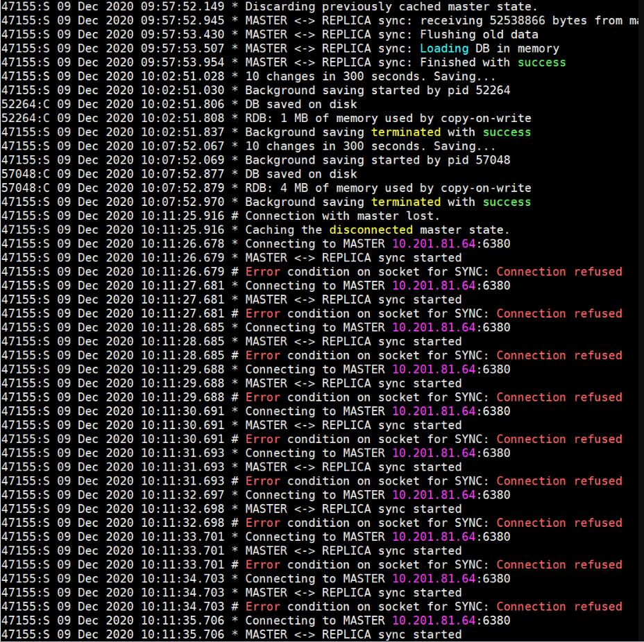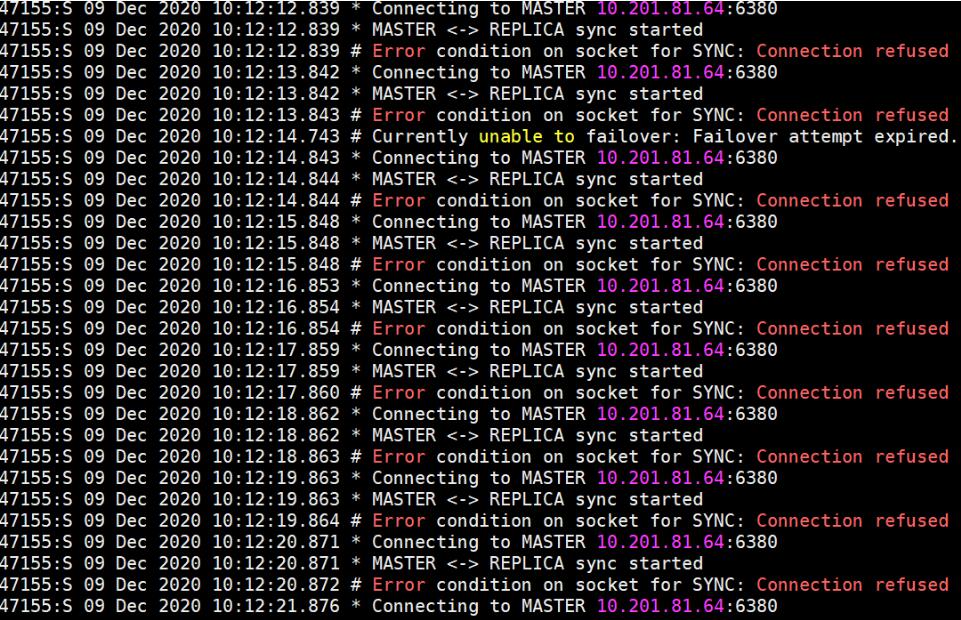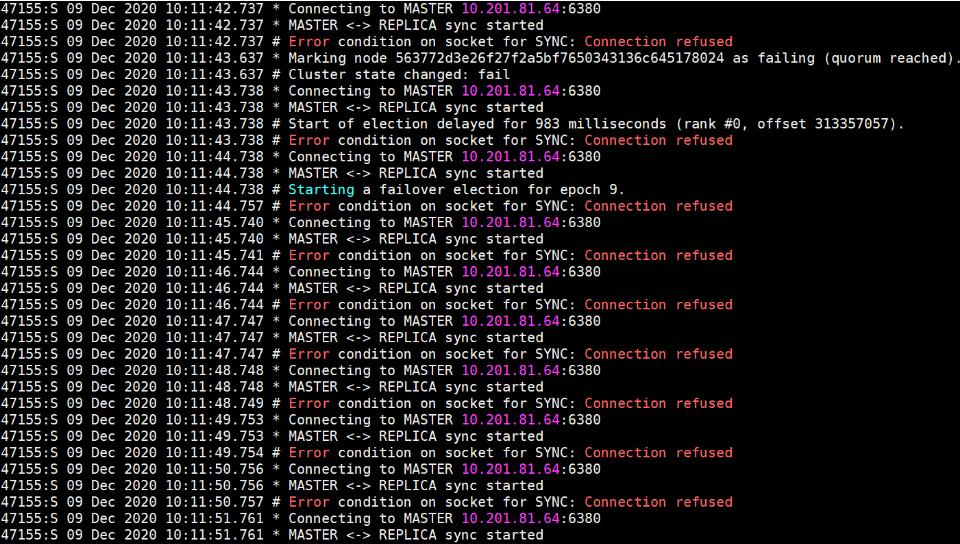 10:11:25:kill掉81.64上的6380,可以看到其从节点很快提示连接主节点失败,并且开始一秒钟一次的重连操作