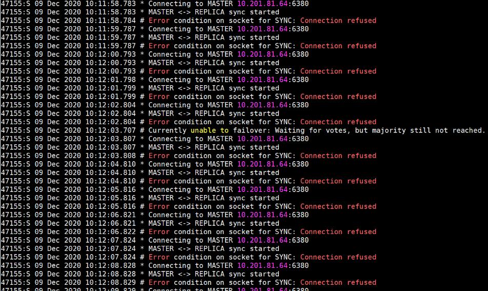 10:12:03:在重连20次失败后,从节点打印日志,等待投票选举,但是没有达到多数赞成,于是继续重连之前的主节点