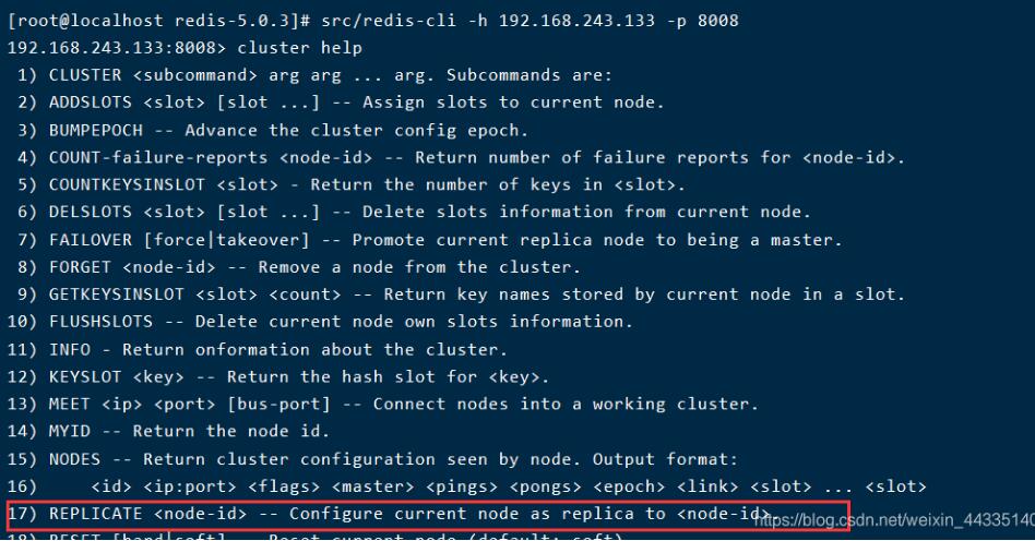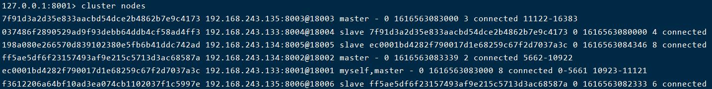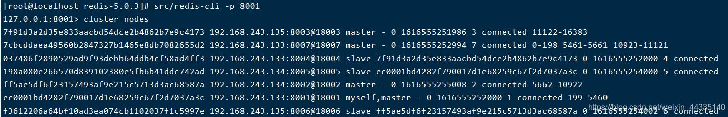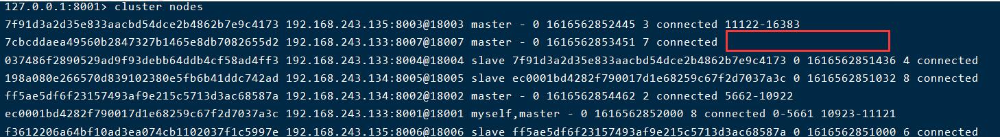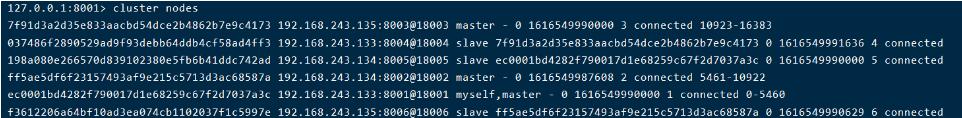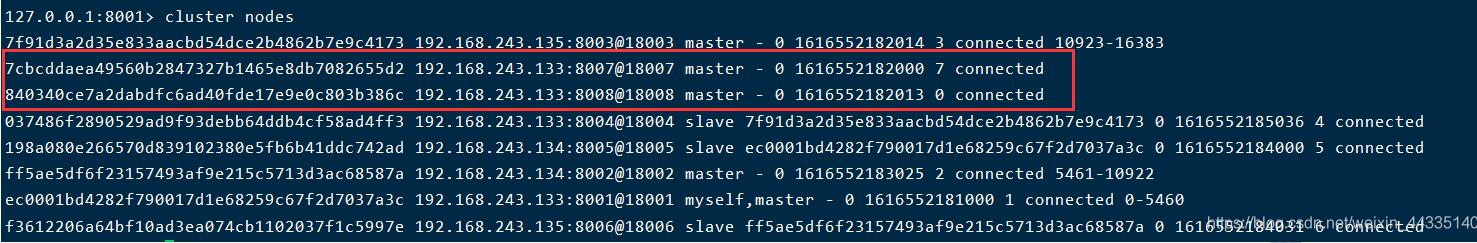 [root@localhost redis-5.0.3]# src/redis-cli --cluster add-node 192.168.243.133:8007 192.168.243.133:8001 [root@localhost redis-5.0.3]# src/redis-cli --cluster add-node 192.168.243.133:8008 192.168.243.133:8001