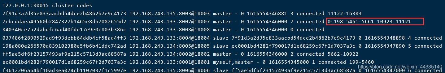 我们发现对于新加入的节点默认都是master节点,最重要的是,他们都没有分配slots槽位,所以根据Redis集群分片的原理,这些刚加入集群的节点实际上是不能读写数据的。