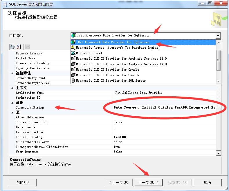 2.3选择目标Sql Server驱动器名称->输入目标数据库链接地址字符串->点击下一步