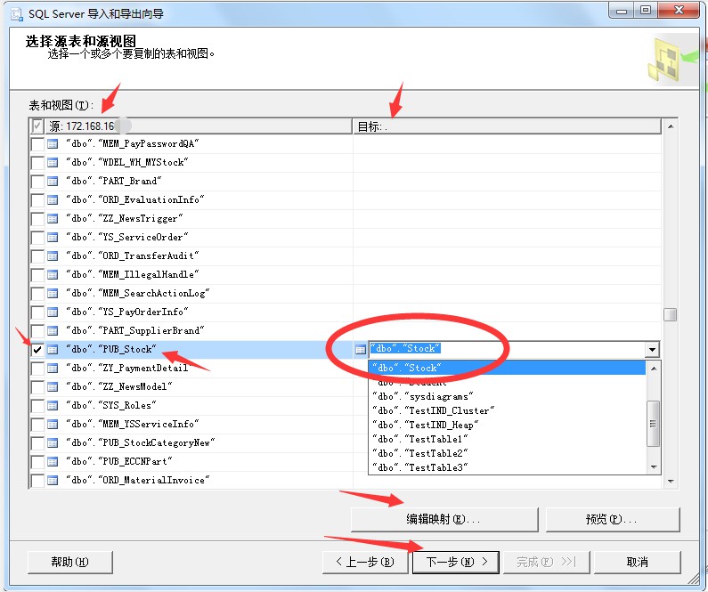 2.5选择源头数据库表,再选择目标数据库表,如果只需要源头数据库表某一部分字段数据,或者源头数据库表跟目标数据库表字段名称不一致,可以通过编辑映射(E)来编辑->点击下一步