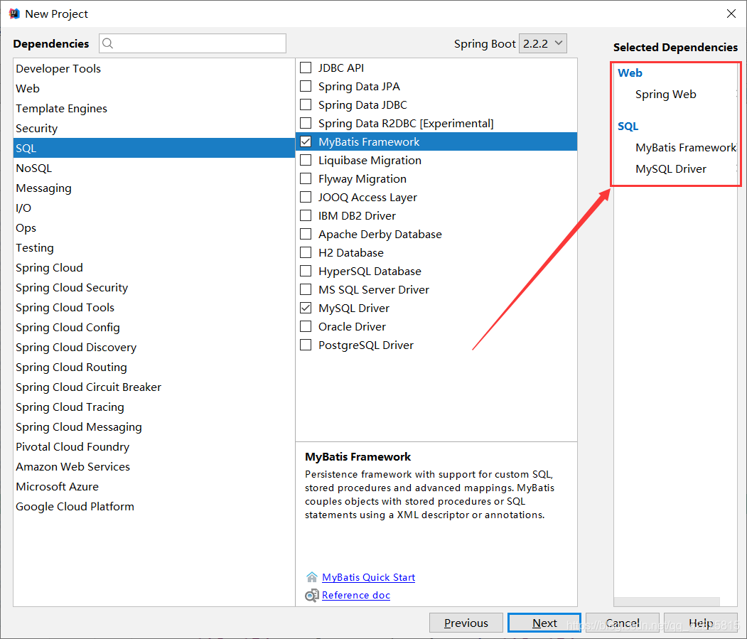 3、Next后如图所示,勾选中需要的依赖,Spring Initializr会自动导入所需的starter