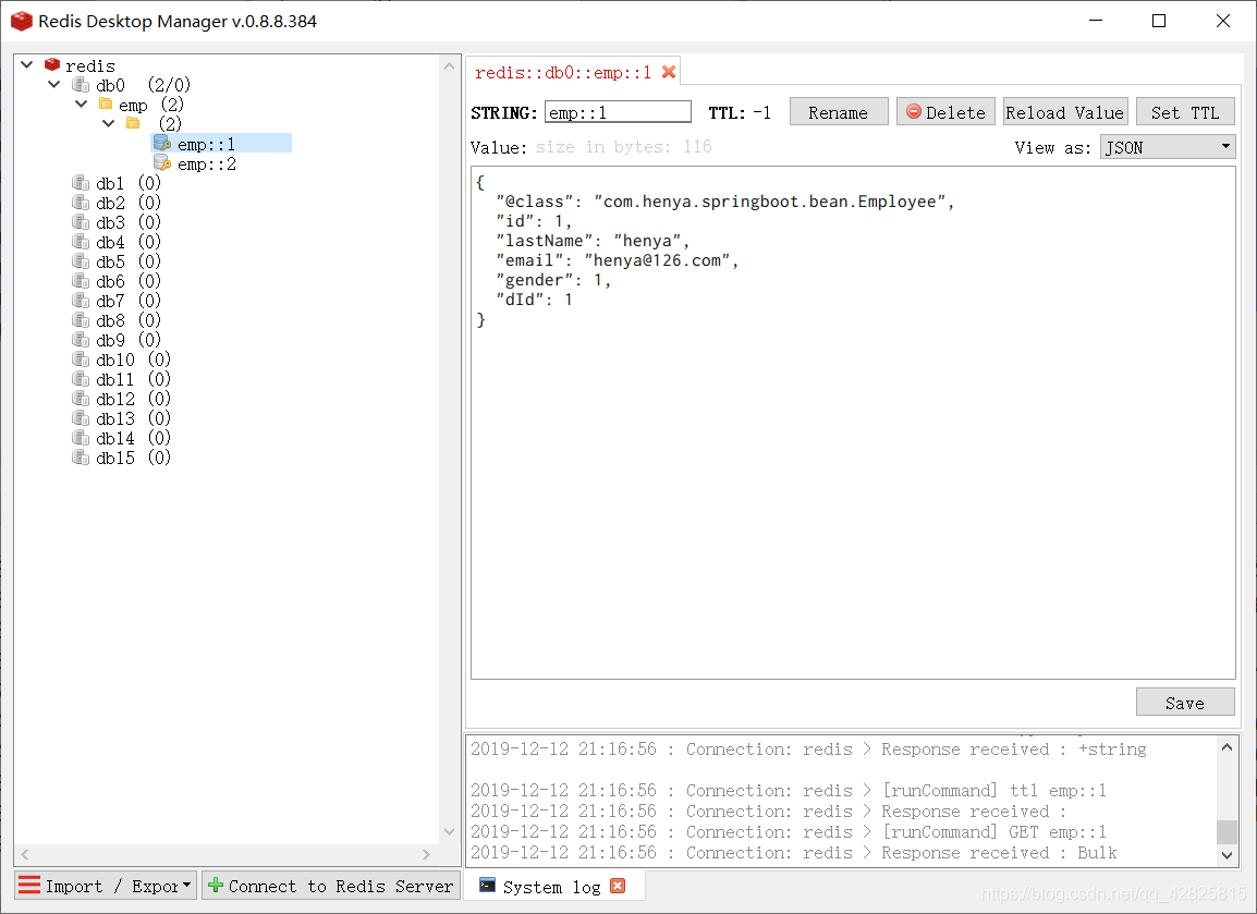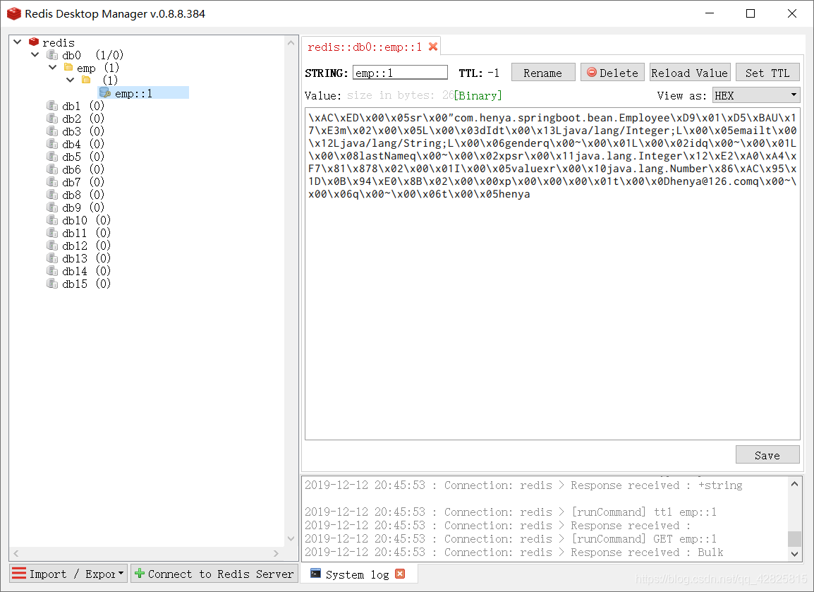 3、此时使用RedisDesktopManager工具查看redis时有数据,并且cacheName为emp,如图所示