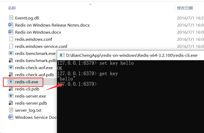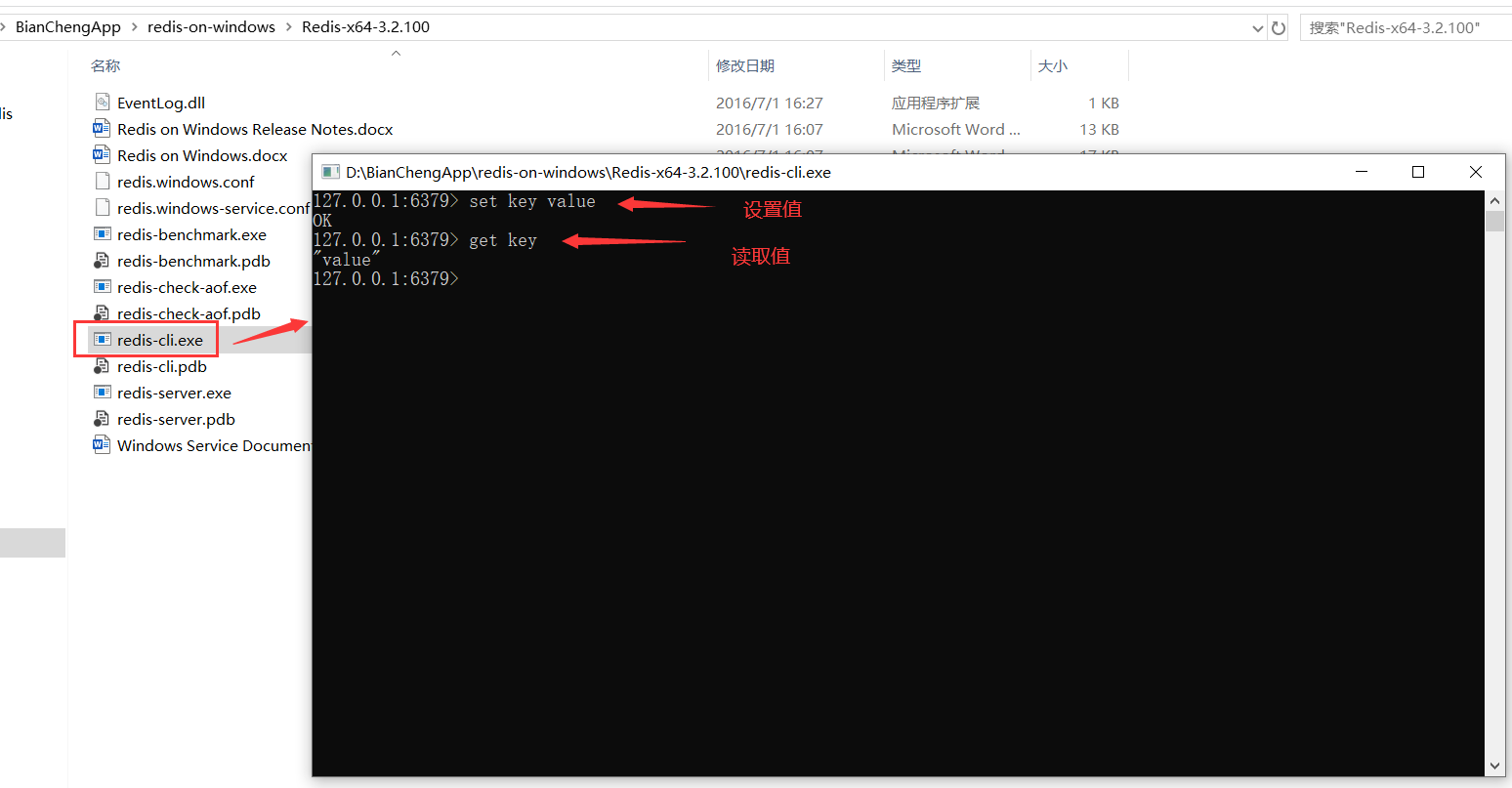 Windows服务设置成功后不用启动redis-server.exe服务端,直接运行redis-cli.exe简易客户端可以发现此时也可以正常使用。