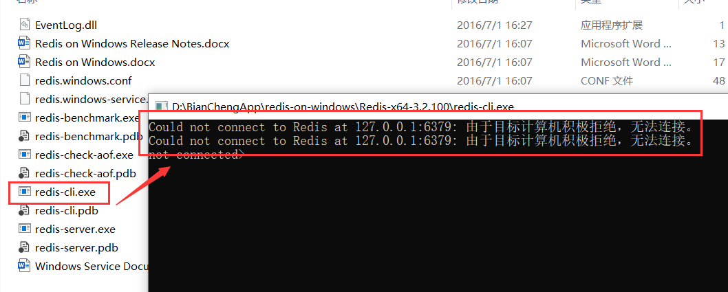 如果没有运行redis-server.exe当服务,直接运行redis-cli.exe的话,此时是无法操作Redis的。