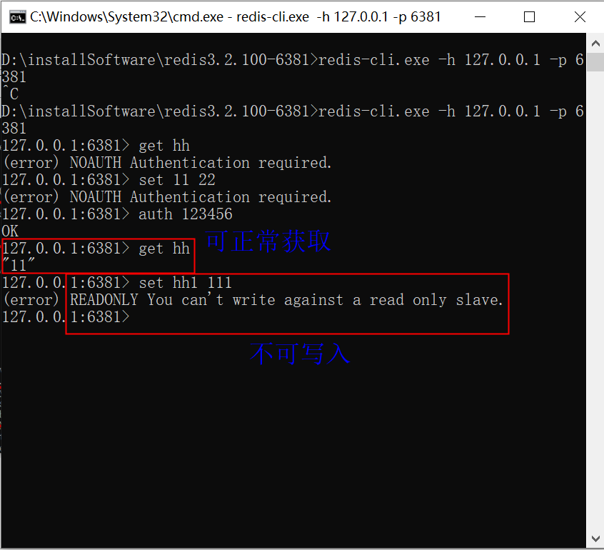 ②,客户端,在客户端可获取主客户端添加的数据,但是无法写入数据(如果master设置密码,slave需认证密码:author密码)