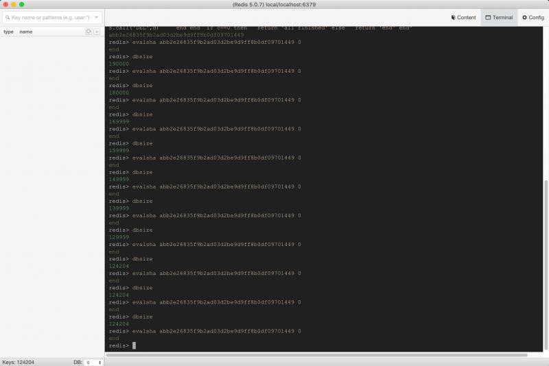 这段lua只要在套上shell进行循环就可以直接在生产上跑了。经过估算大概在12分钟左右能删除掉500w的数据。