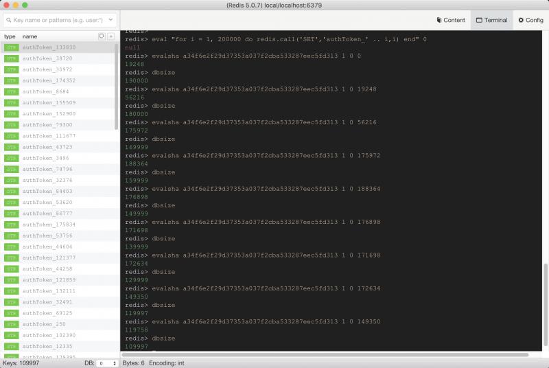 eval “for i = 1, 200000 do redis.call(‘SET’,’authToken_’ .. i,i) end” 0