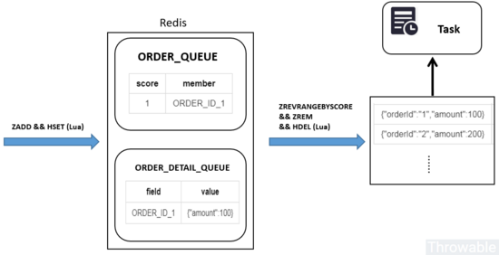 这里其实有一个性能隐患,命令 ZREVRANGEBYSCORE 的时间复杂度可以视为为 O(N) , N 是集合的元素个数,由于这里把所有的订单信息都放进了同一个 Sorted Set ( ORDER_QUEUE )中,所以在一直有新增数据的时候, dequeue 脚本的时间复杂度一直比较高,后续订单量升高之后会此处一定会成为性能瓶颈,后面会给出解决的方案。