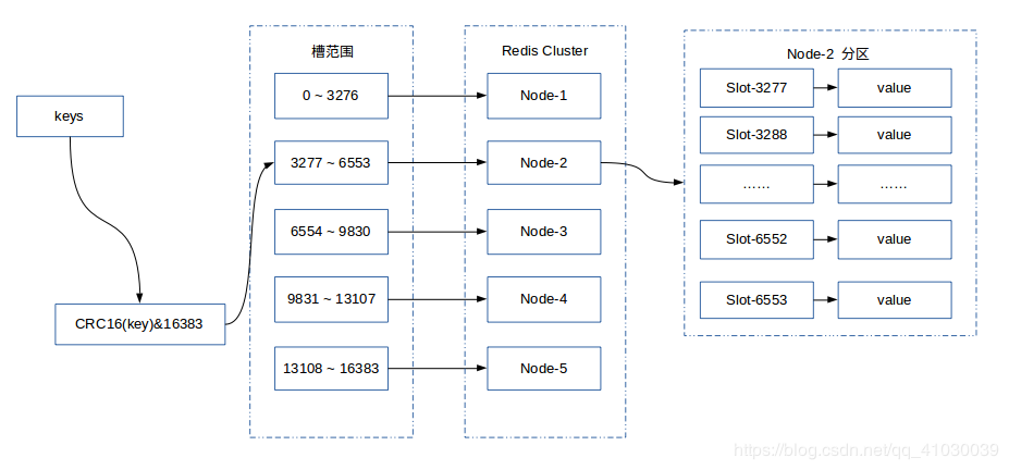 Redis集群使用的是哈希槽,有16384个哈希槽,决定一个key分配到哪个槽的算法:计算该key的CRC16,结果再模16384.