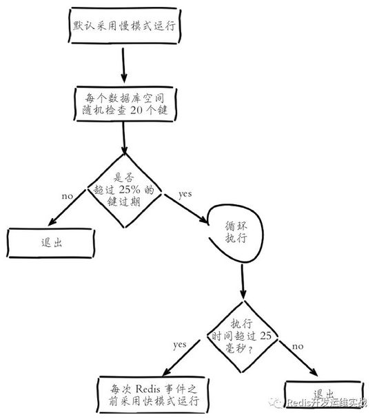 单单靠惰性删除,肯定不能删除所有的过期key,考虑到Redis的单线程特性,Redis使用了定期删除策略,采用策略是从一定数量的数据库的过期库中取出一定数量的随机键进行检查,不为空则删除。不保证实时删除。有兴趣的同学可以看看activeExpireCycle中具体实现,还是挺有意思的,下图是个示意图