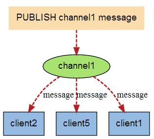 了解了pubsub_channels字典的结构之后, 解释PUBLISH命令的实现就非常简单了: 当调用PUBLISH channel message命令, 程序首先根据channel定位到字典的键, 然后将信息发送给字典值链表中的所有客户端。