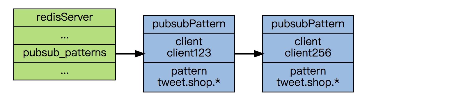 作为例子,下图展示了一个包含两个模式的 pubsub_patterns 链表, 其中 client123 和 client256 都正在订阅 tweet.shop.* 模式: