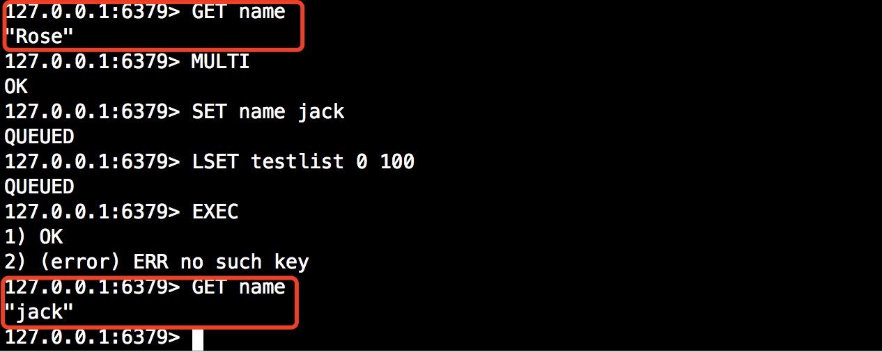 从上面的结果可以看出,在开启事务前name 值为Rose,在开启事务先后执行了SET命令和LSET命令,但是LSET命令是错误的,当我们调用EXEC执行事务完事务以后,在回头看事务中的SET命令已经生效,并未回滚,因为在次过程中该命令没有显示的报错,所以可以说redis的事务不支持原子性。