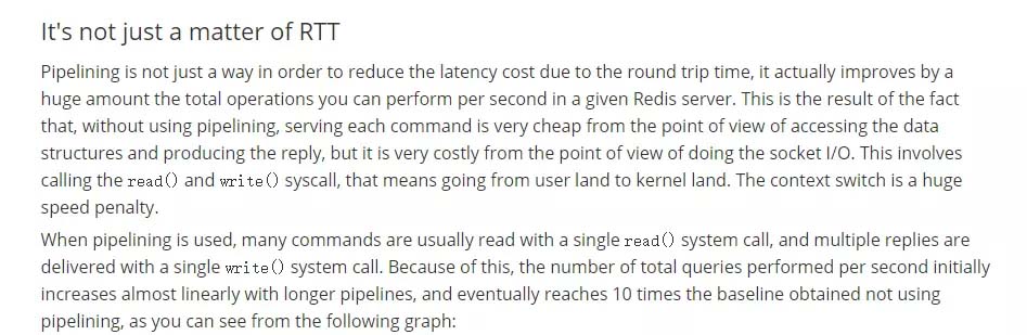 Pipeline管道机制不单单是为了减少RTT的一种方式,它实际上大大提高了Redis的QPS。原因是,在没有使用管道机制的情况下,从访问数据结构和产生回复的角度来看,为每个命令提供服务是非常便宜的。但是从底层套接字的角度来看,这是非常昂贵的,这涉及read()和write()系统调用,从用户态切换到内核态,这种上下文切换开销是巨大。而使用Pipeline的情况下,通常使用单个read()系统调用读取许多命令,然后使用单个write()系统调用传递多个回复,这样就提高了QPS