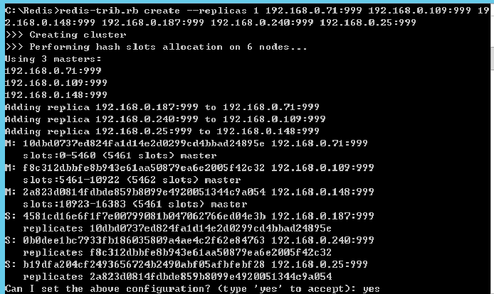 redis-trib.rb create –replicas1 192.168.0.71:999 192.168.0.109:999 192.168.0.148:999 192.168.0.187:999 192.168.0.240:999 192.168.0.25:999