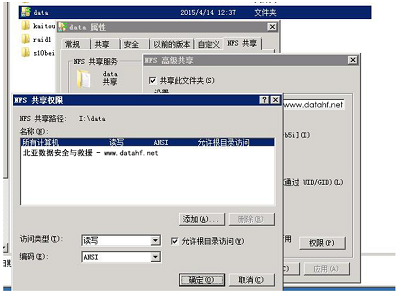 重启完成后我们对存放镜像数据的文件夹进行操作,右键—NFS共享标签页里面勾选共享此文件夹,然后有个重点是在权限里面勾选允许根目录访问,访问类型选择读写。