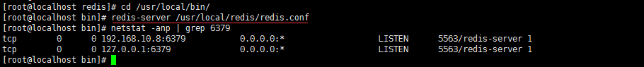 cd /usr/local/bin/ redis-server /usr/local/redis/redis.conf netstat -anp | grep 6379