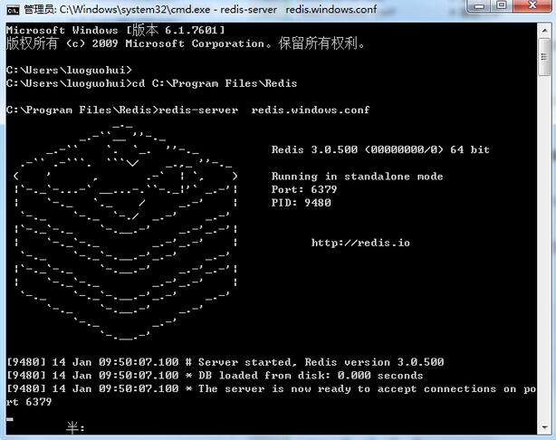 已经开启了对应服务的,我们让它保持,下面例子需要用到。如果没有开启的,我们命令开启,进入Redis的安装目录(博主的是C:\Program Files\Redis),然后如下命令开启: